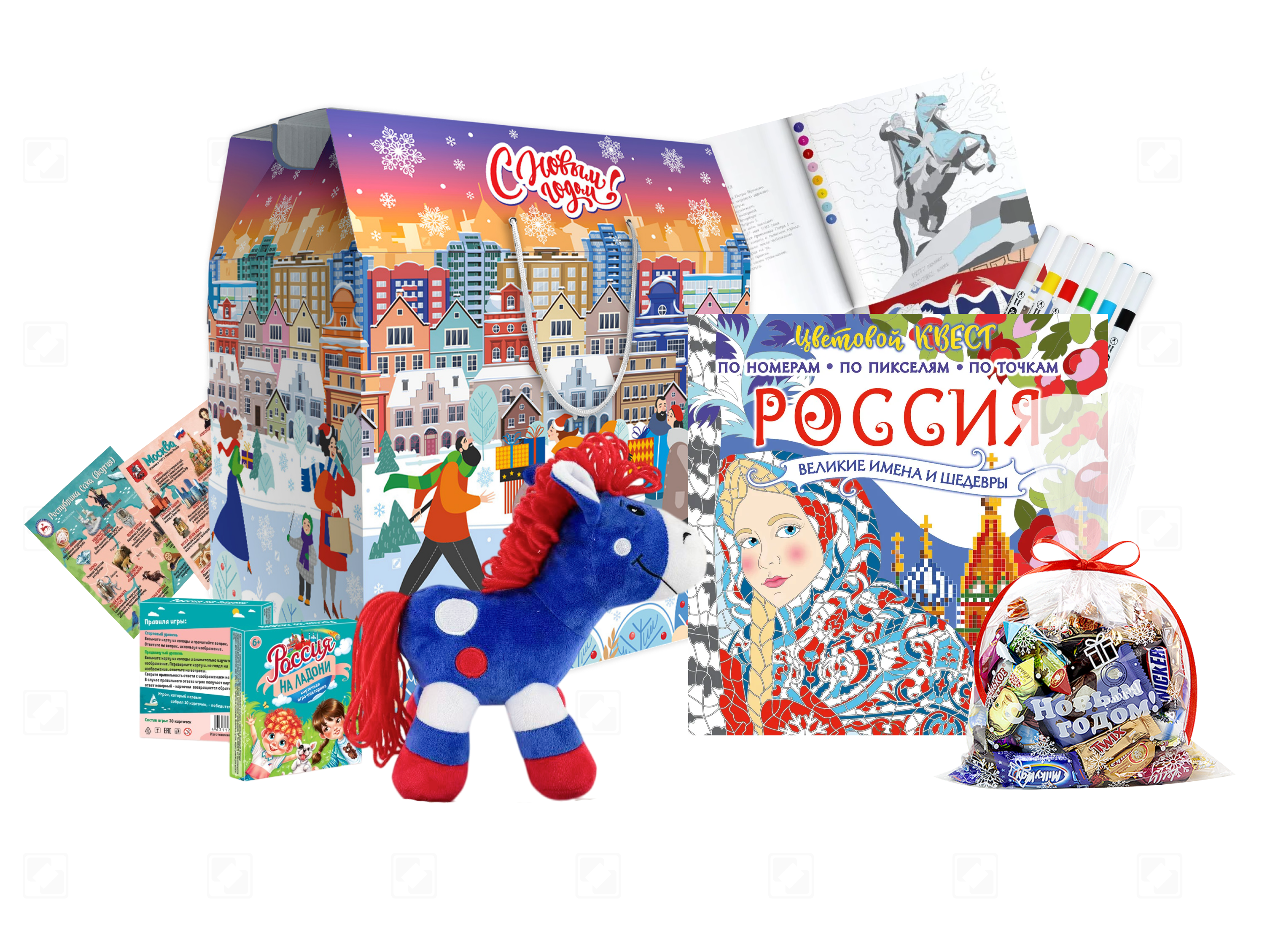 Яркая подарочная коробка скрывает массу удовольствия: плюшевый друг «Рио триколор», красочные российские сюжеты для творчества в раскрашивании, комплект из шести акриловых маркеров и захватывающую настольную игру "Россия на ладони".