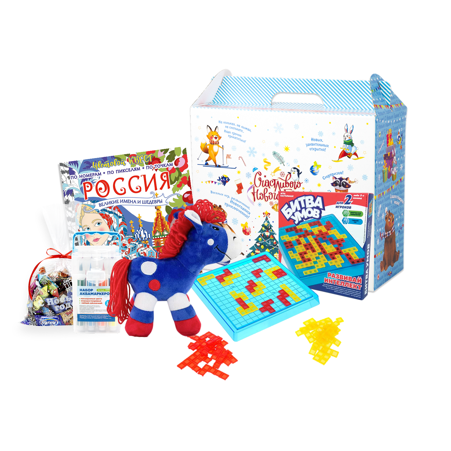 В комплект входят: очаровательная плюшевая лошадка – лучший друг малыша и символ наступающего года, упаковка ярких цветных аквамаркетов (12 шт.) для рисования и раскрашивания, увлекательная настольная игра для развития логики, а также оригинальный творческий альбом, который поможет поближе познакомиться с Россией и изучать культуру нашей страны.