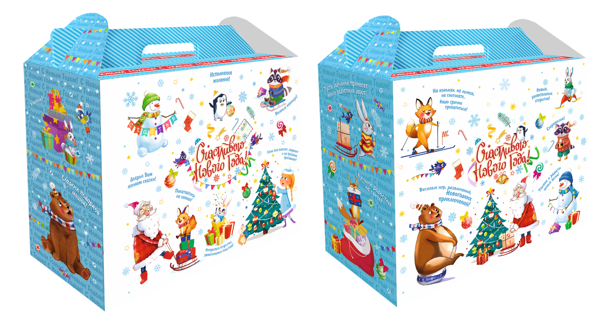 Все это красиво оформлено в веселую праздничную коробку, которая порадует любого ребенка!