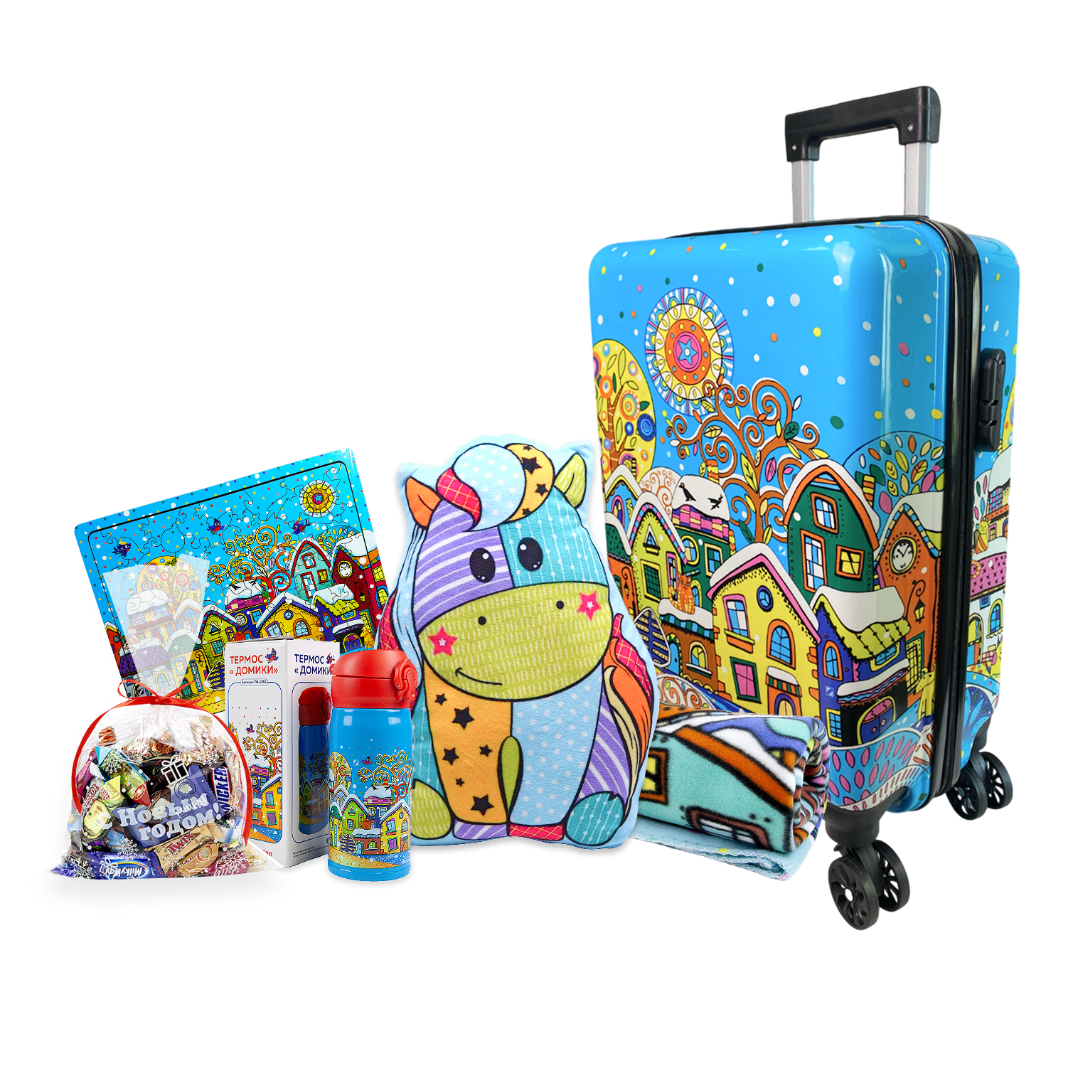 В набор входит подушка-игрушка в виде символа года лошадки, увлекательный деревянный пазл для развития логики, стильный термос с веселым рисунком, мягкий плед для уюта зимними вечерами и практичный детский чемодан. Идеальный сюрприз для маленького исследователя!