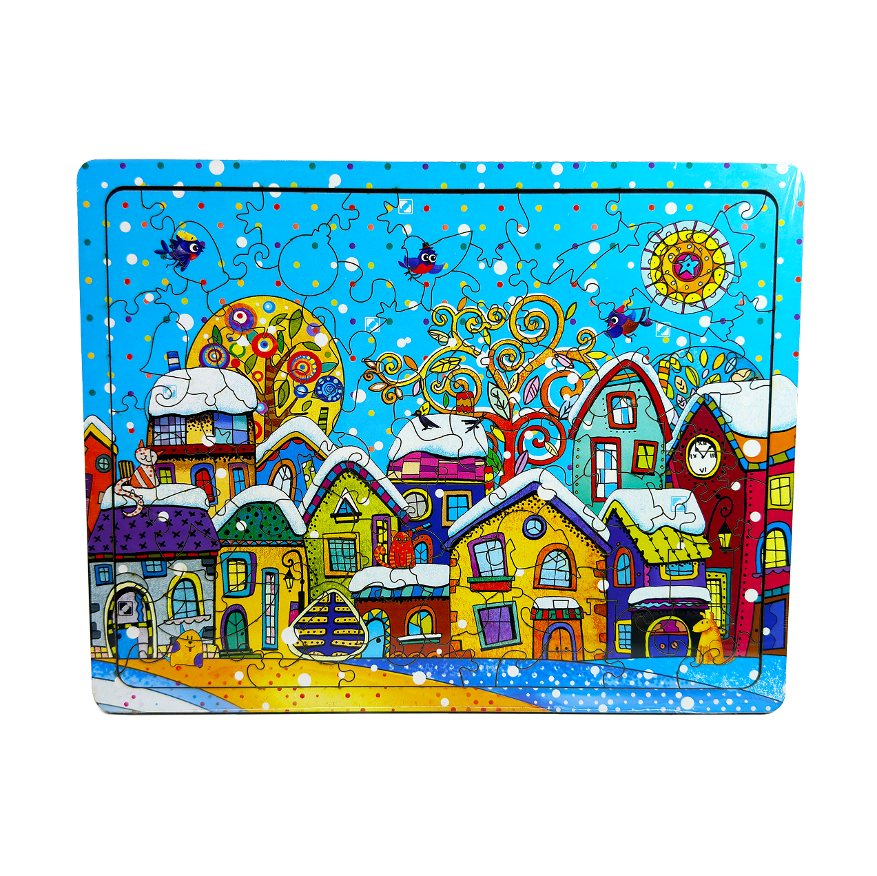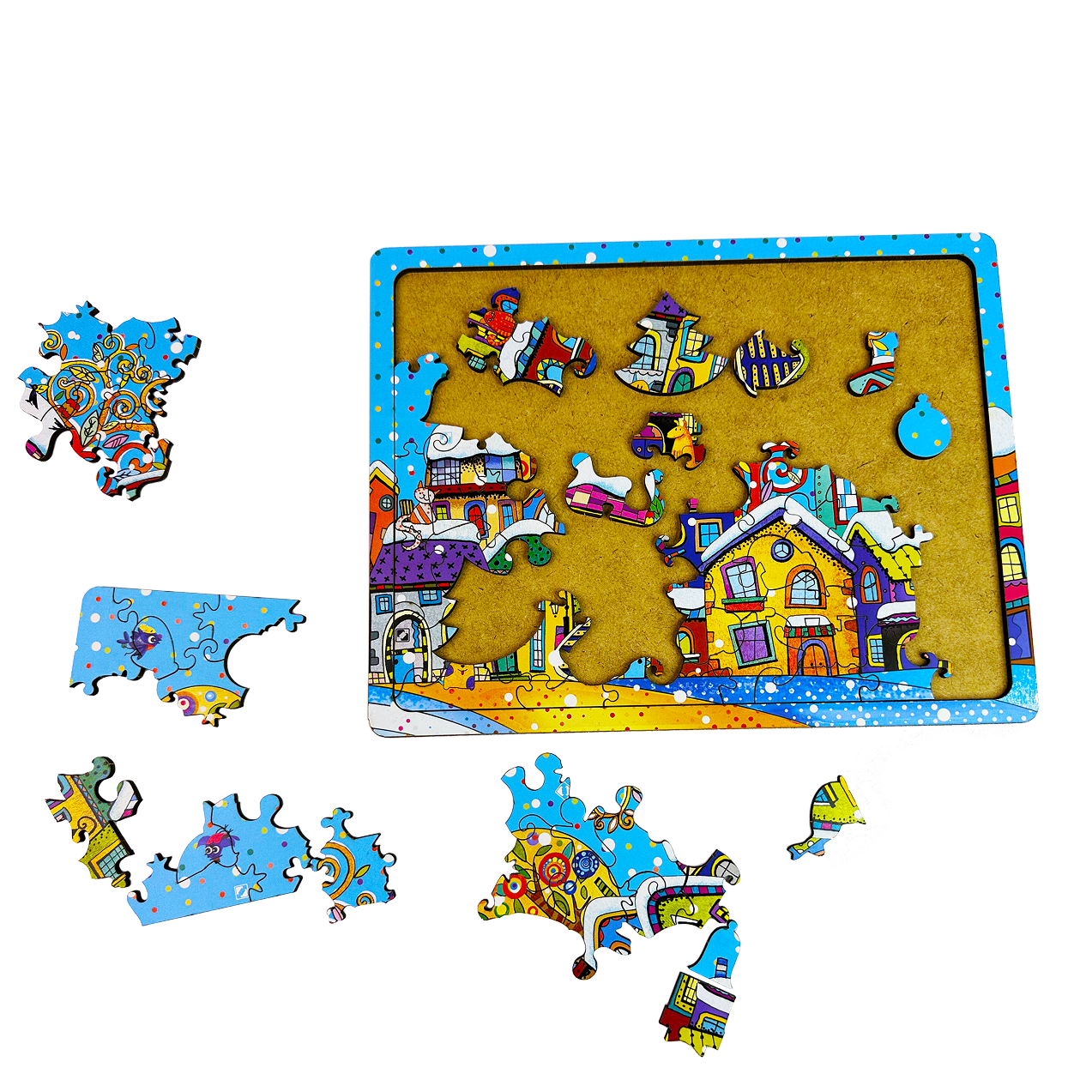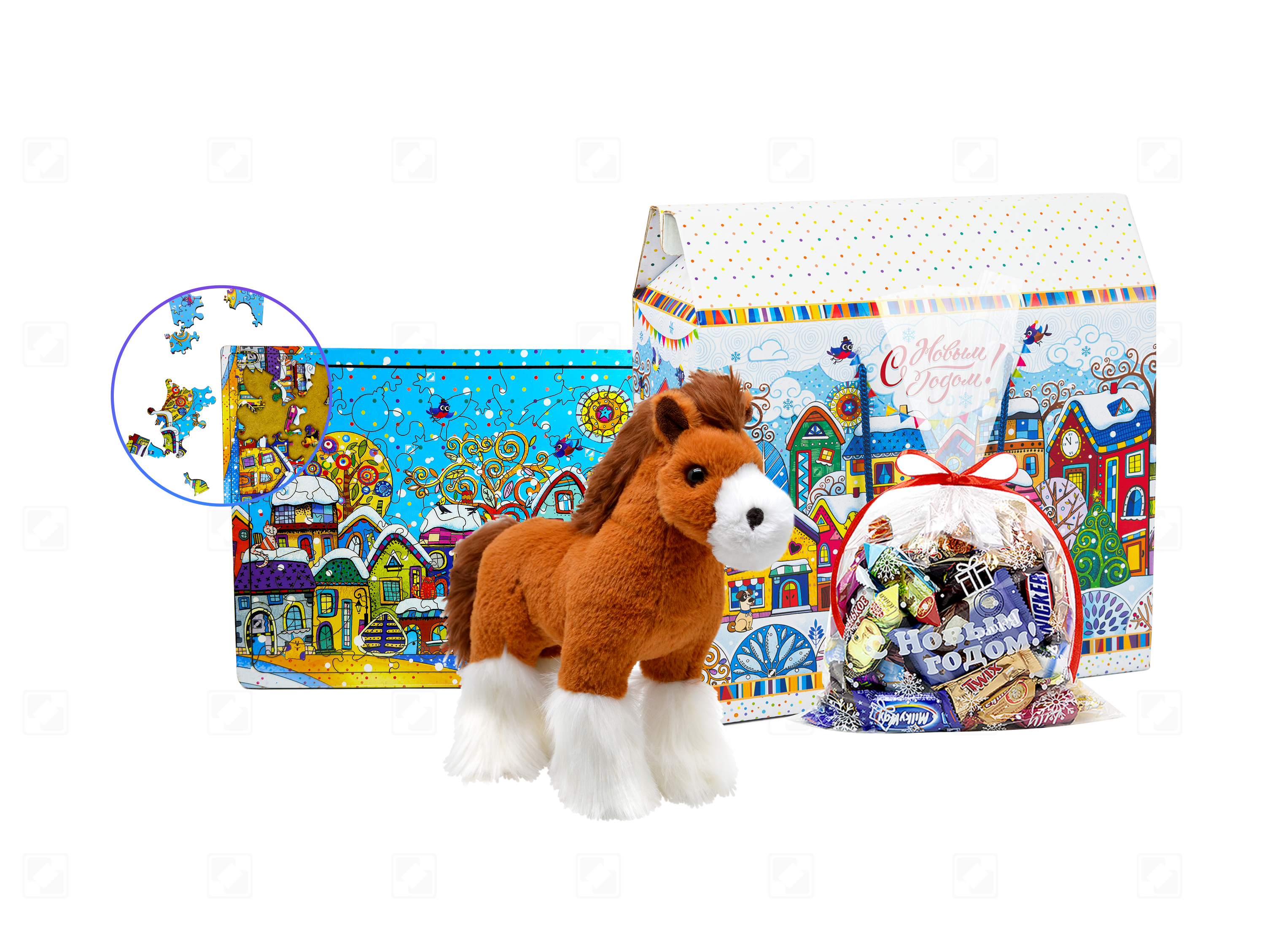Внутри уютно разместились плюшевый друг — мягкая игрушка Святогор, увлекательный пазл из натурального дерева «Сказочный город», он поможет ребенку развивать мелкую моторику, а также вкуснейшие кондитерские лакомства.